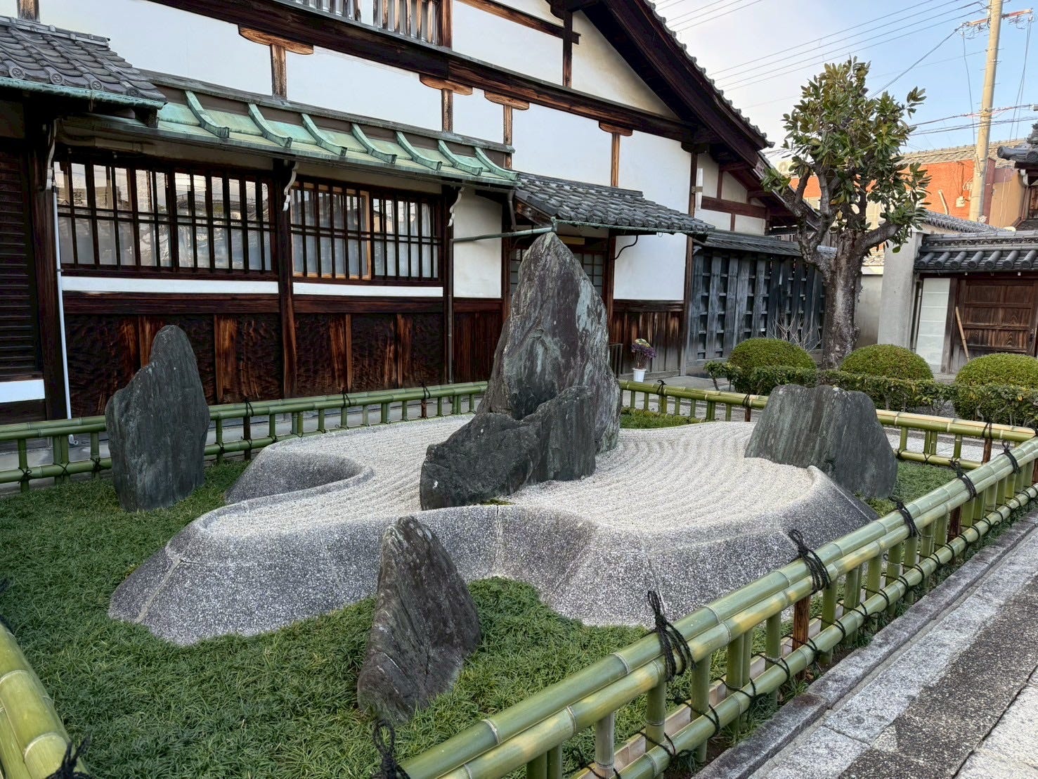 This garden was built after a pine tree died, and instead of replacing it, Mirei transformed the space into something new. White sand, stones, and a bamboo fence surround the area.