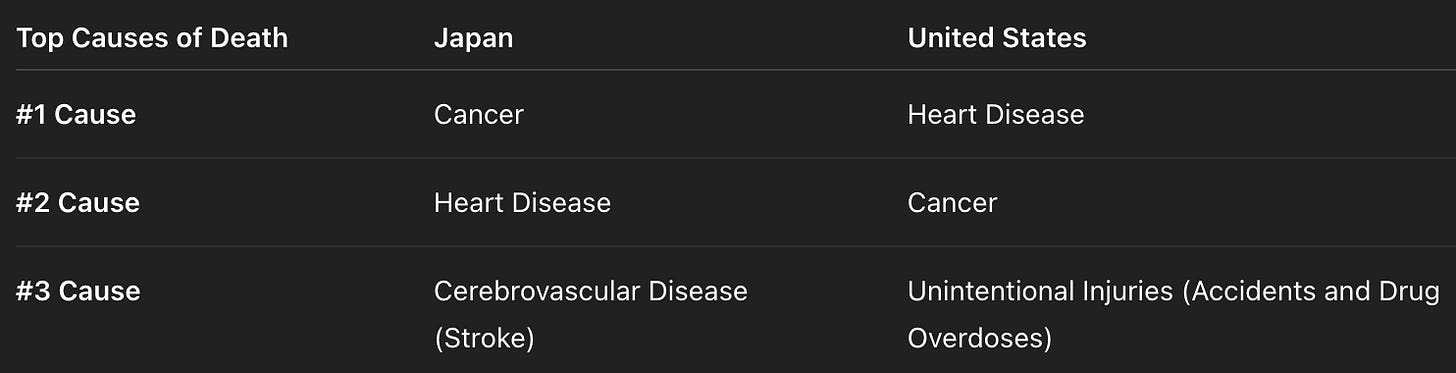 Chronic illnesses—especially heart disease and stroke—are lower in Japan than in the US. Cancer is still high, but Japan’s slower progression of chronic disease makes a huge difference in how long people live.